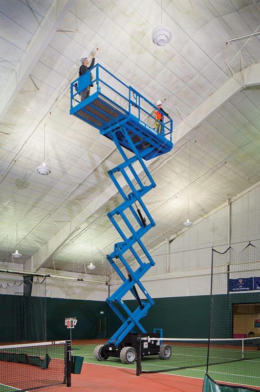 Offering quiet, zero-emissions operation, the all-electric Genie® GS™-3369 DC rough terrain scissor lift is excellent for both indoor and outdoor use. Thanks to its reduced dimensions, it is ideal for indoor work in confined spaces. Additionally, its rough terrain capabilities make it well-suited to construction, maintenance and installation applications on challenging ground, sand and mud.